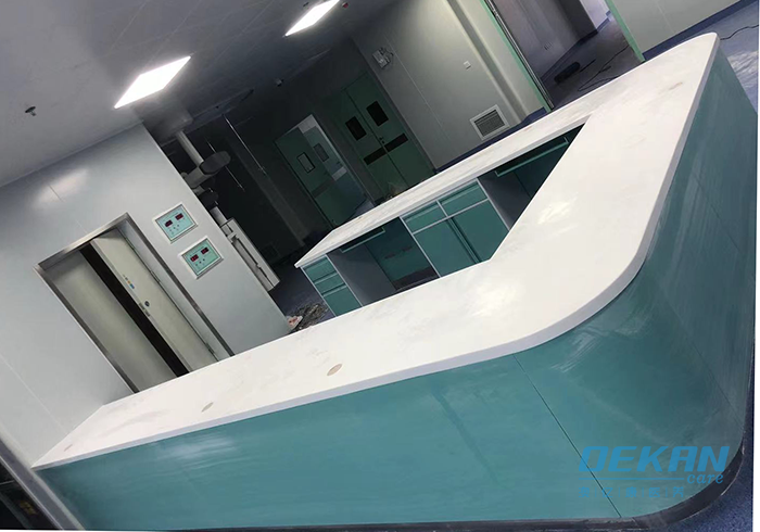 护士站导医台参数:台面:采用医用复合亚克力人造石制作。其材料厚度≥12.0mm。材料性能符合医院等高标准的环境卫生及消毒要求;柜体:采用1.0mm厚优质电解钢板,柜体底部采用全304#不锈钢踢脚线,地脚线前端内缩100mm,无触脚感,高度为150mm等。