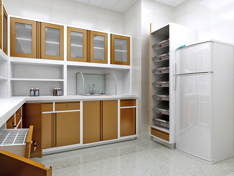 医用处置柜的设计要符合各科室的不同需求,要便于疏散且洁污分明,可以使用蓝色、绿色等为主色调,这样有助于患者就医时的不安情绪。此外,柜体的设计应该无死角、不易积垢,且水龙头为感应式,烘手器最好以擦手纸为宜。